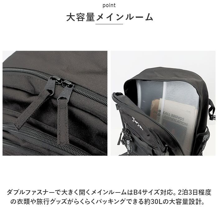 ・ダブルファスナーで大きく開くメインルームはB4サイズ対応。2泊3日程度の衣類や旅行グッズがらくらくパッキングできる約30Lの大容量設計。