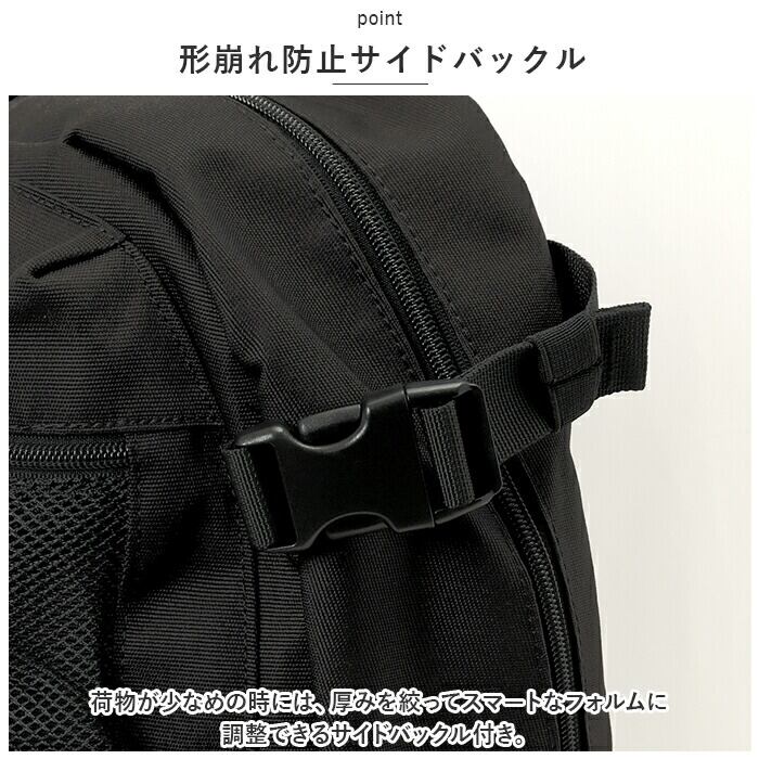 ・荷物が少なめの時には、厚みを絞ってスマートなフォルムに調整できるサイドバックル付き。