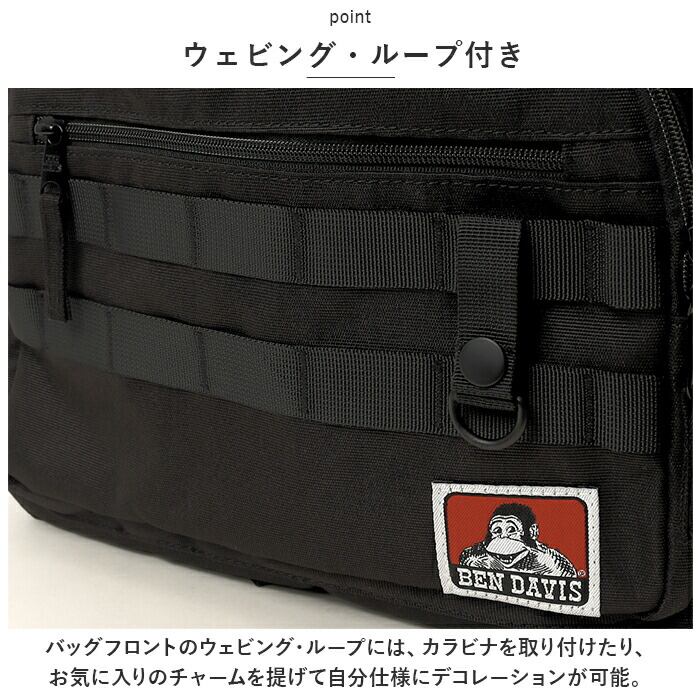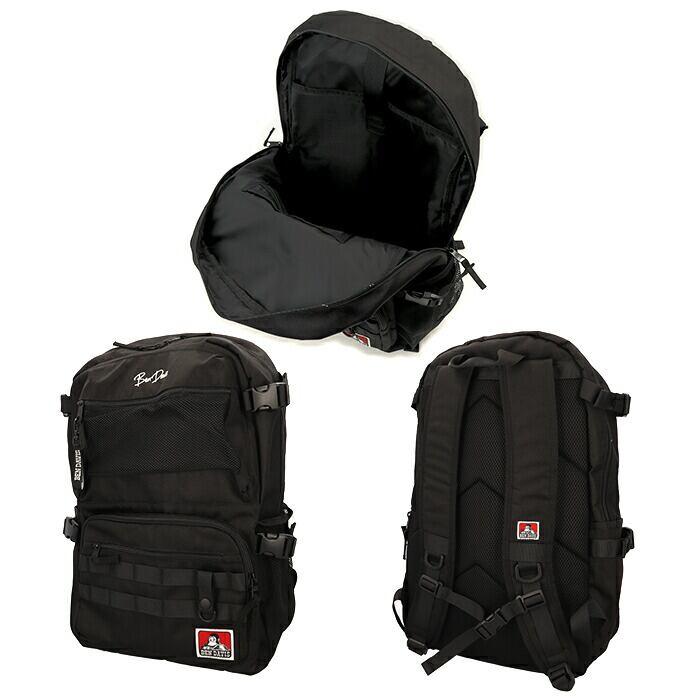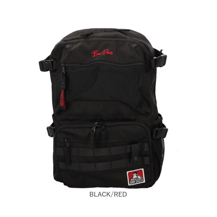 ・バックパック前面に、スマホやパスケースのような普段使いのアイテムがサッと取り出せるファスナーポケット×3を配置。「BEN DAVIS」のロゴ刺繍が目を惹くメッシュファスナーポケットは、小物を「魅せて」収納したいときに最適。