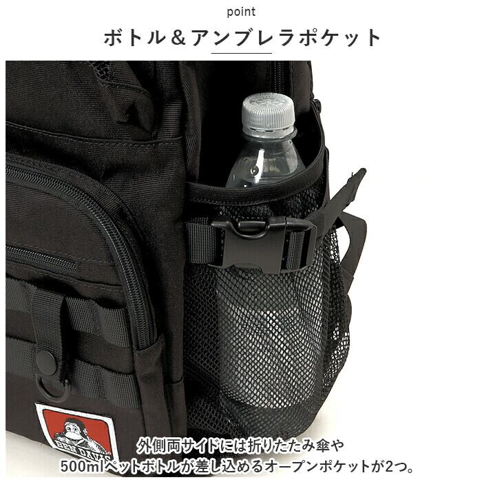 ・外側両サイドには折りたたみ傘や500mlペットボトルが差し込めるオープンポケットが2つ。