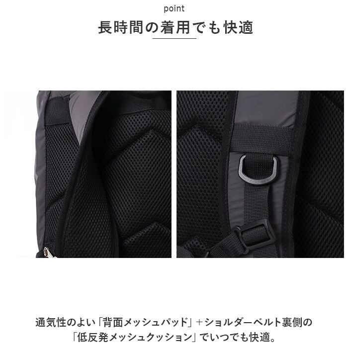 ・通気性のよい「背面メッシュパッド」+ショルダーベルト裏側の「低反発メッシュクッション」でいつでも快適。