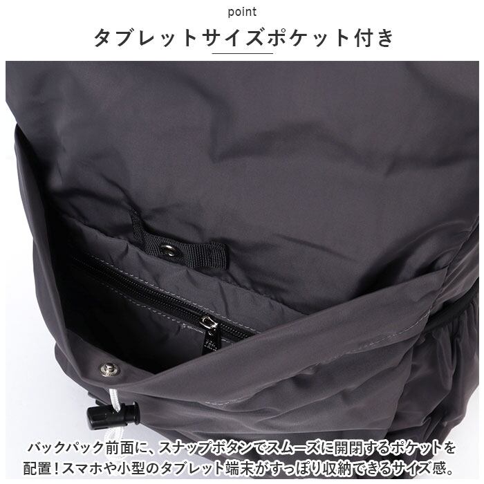 ・バックパック前面に、スナップボタンでスムーズに開閉するポケットを配置!スマホや小型のタブレット端末がすっぽり収納できるサイズ感。