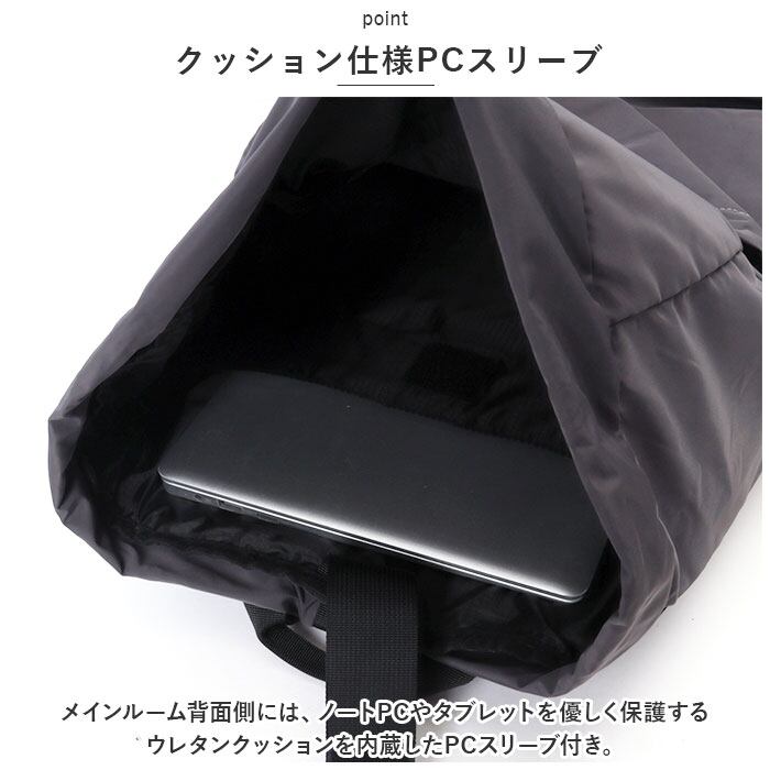 ・メインルーム背面側には、ノートPCやタブレットを優しく保護するウレタンクッションを内蔵したPCスリーブ付き。