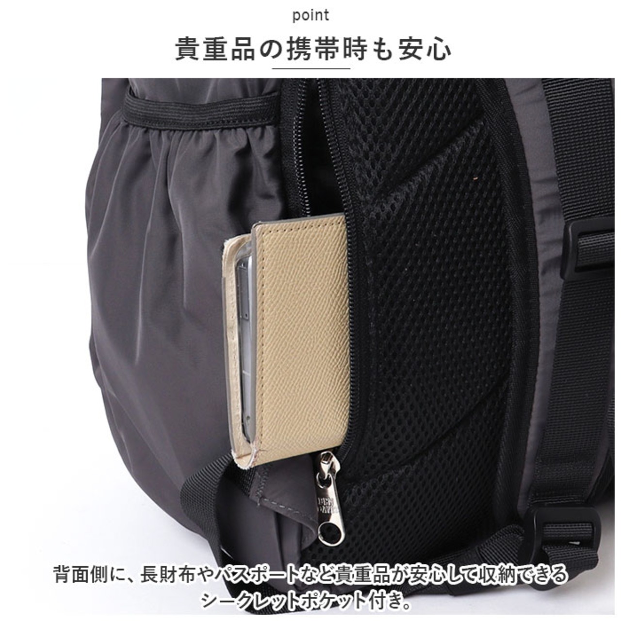 ・背面側に、長財布やパスポートなど貴重品が安心して収納できるシークレットポケット付き。