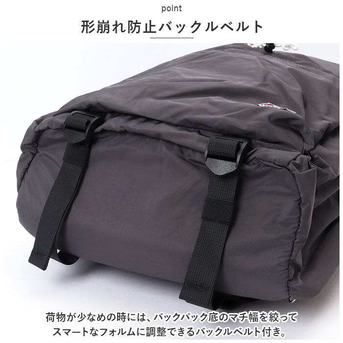 ・荷物が少なめの時には、バックパック底のマチ幅を絞ってスマートなフォルムに調整できるバックルベルト付き。