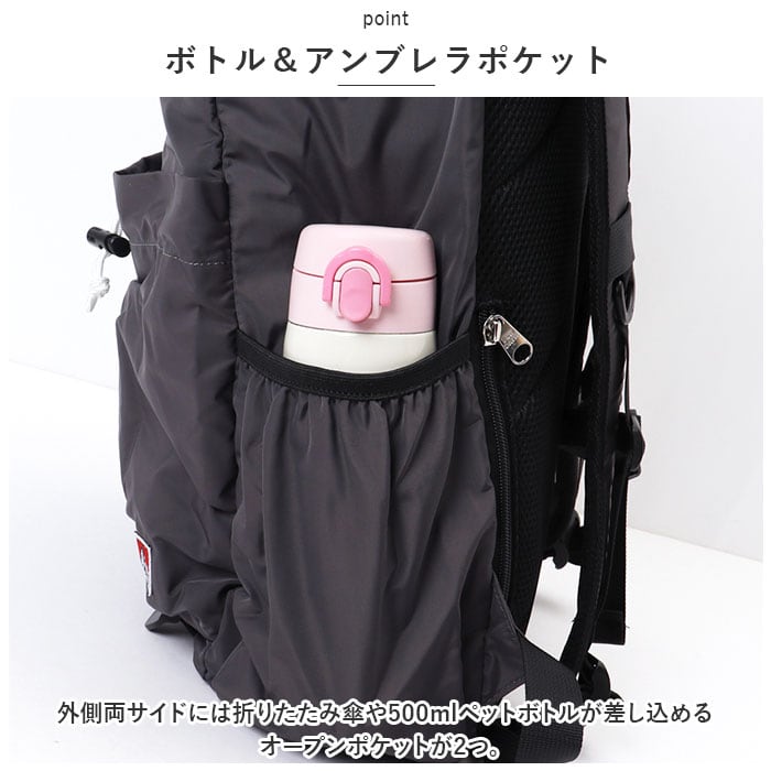 ・外側両サイドには折りたたみ傘や500mlペットボトルが差し込めるオープンポケットが2つ。