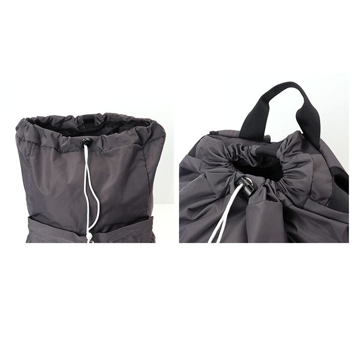 ・メインルームは巾着のように口がキュッと絞れるドローストリング式。B4サイズに対応したゆったりサイズで、1泊2日程度の衣類やトラベルグッズもらくらくパッキング可能。