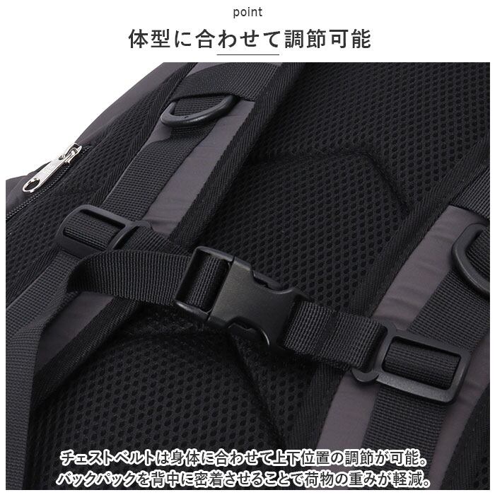 ・チェストベルトは身体に合わせて上下位置の調節が可能。バックパックを背中に密着させることで荷物の重みが軽減。