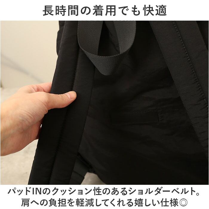 ・パッドINのクッション性のあるショルダーベルト。肩への負担を軽減してくれる嬉しい仕様◎