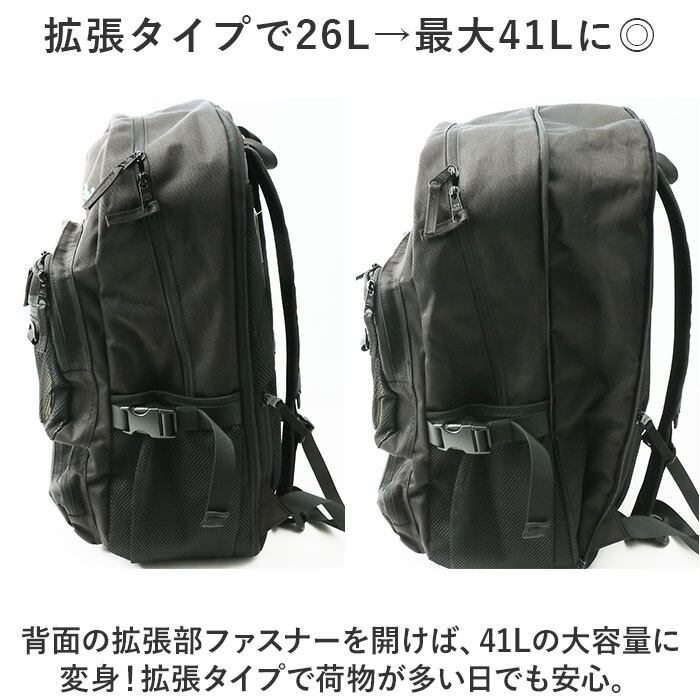 ・背面の拡張部ファスナーを開けば、41Lの大容量に変身!拡張タイプで荷物が多い日でも安心。
