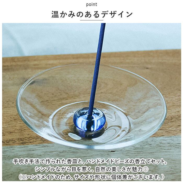 ・手吹き手法で作られた香皿と、ハンドメイドビーズの香立てセット。シンプルながら目を惹く、自然の美しさが魅力◎(※ハンドメイドのため、サイズや形状に個体差がございます。)