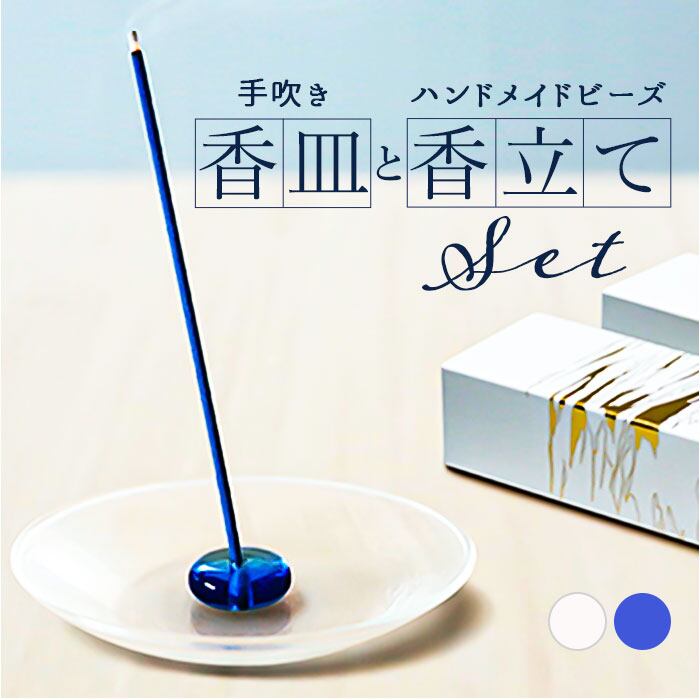 吹きガラス香皿とハンドメイドビーズ香立てのセット