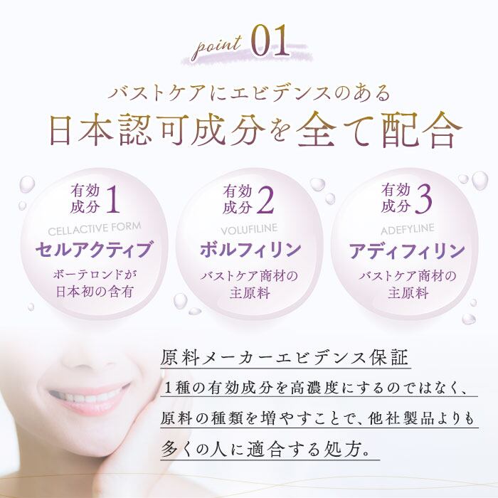 ・スキンケアの考えを取り入れ、さらに美容成分をプラス。お肌にやさしく働きかける、こだわりのバストケア美容液です。