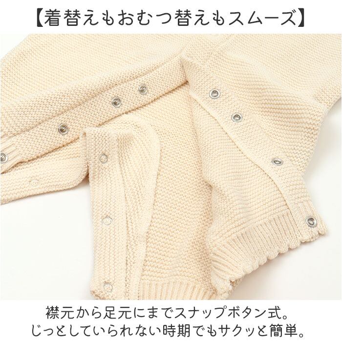 ・襟元から足元にまでスナップボタン式。じっとしていられない時期でもサクッと簡単。