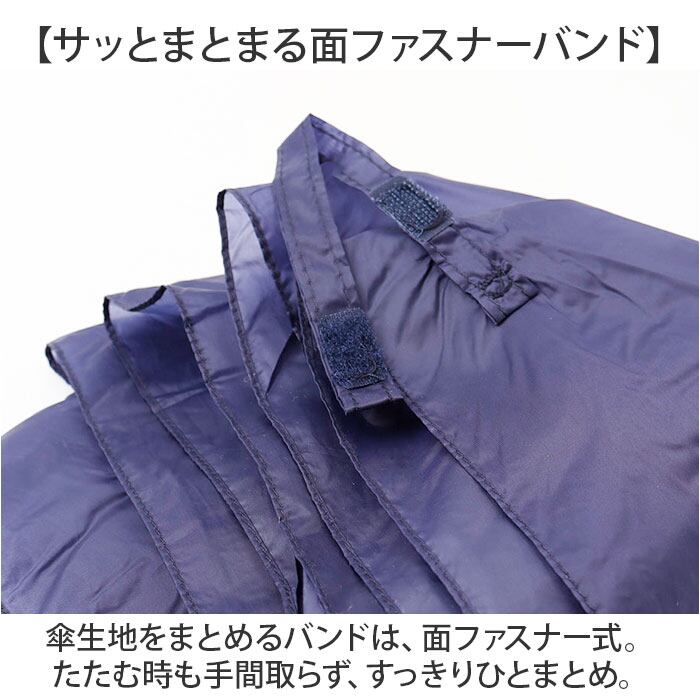 ・傘生地をまとめるバンドは、面ファスナー式。たたむ時も手間取らず、すっきりひとまとめ。