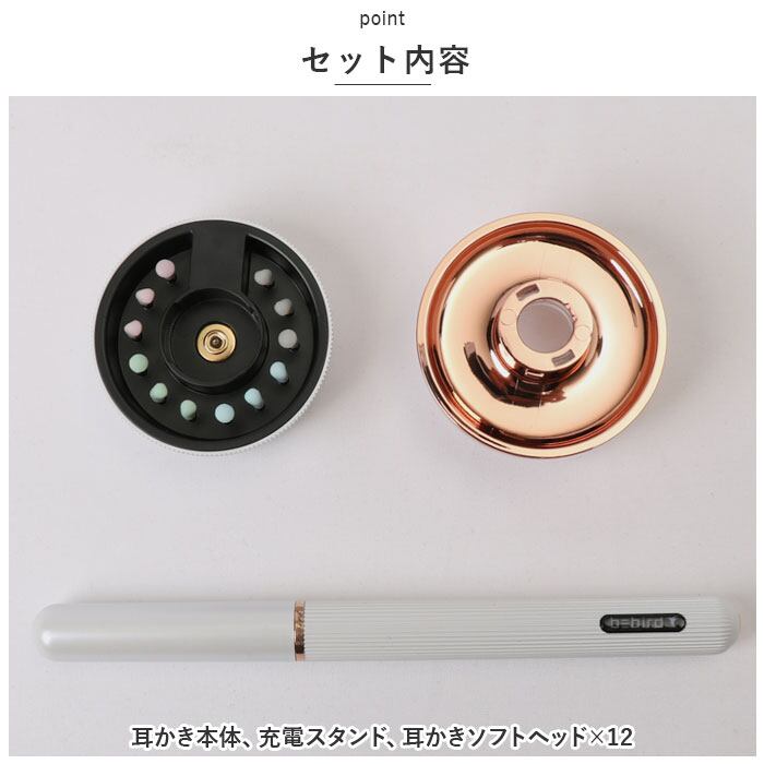 ・耳かき本体、充電スタンド、耳かきソフトヘッド×12