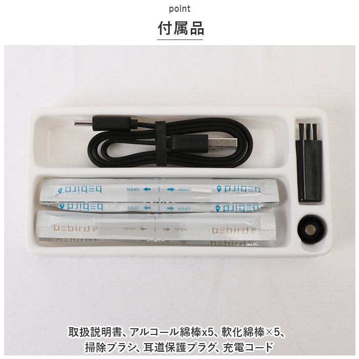 [付属品]保証書、耳かき x 4個、耳かき(大) x 4個、リング型耳かき x 4個、綿棒 x 5本、アルコール綿棒 x 5本、耳穴保護プラグ x 1個、ブラシx 1本、C-Type充電コードx 1本