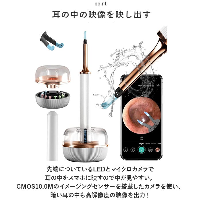・先端についているLEDとマイクロカメラで耳の中をスマホに映すので中が見やすい。CMOS10.0Mのイメージングセンサーを搭載したカメラを使い、暗い耳の中も高解像度の映像を出力!