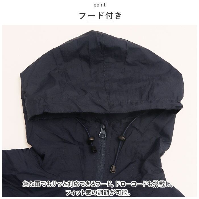 ・急な雨でもサッと対応できるフード。ドローコードも搭載し、フィット感の調節が可能。