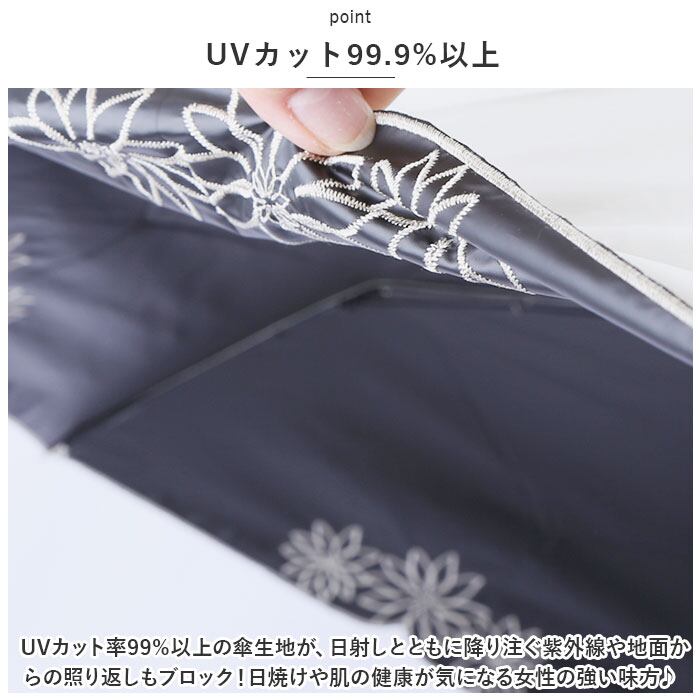 ・UVカット率99%以上の傘生地が、日射しとともに降り注ぐ紫外線や地面からの照り返しもブロック!日焼けや肌の健康が気になる女性の強い味方♪
