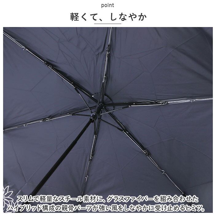 ・スリムで軽量なスチール素材に、グラスファイバーを組み合わせたハイブリッド構成の親骨パーツが強い風をしなやかに受け止めるヒミツ。