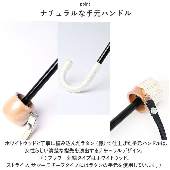 ・ホワイトウッドと丁寧に編み込んだラタン(籐)で仕上げた手元ハンドルは、女性らしい清楚な指先を演出するナチュラルデザイン。(※フラワー刺繍タイプはホワイトウッド、ストライプタイプにはラタンの手元を使用しています。)