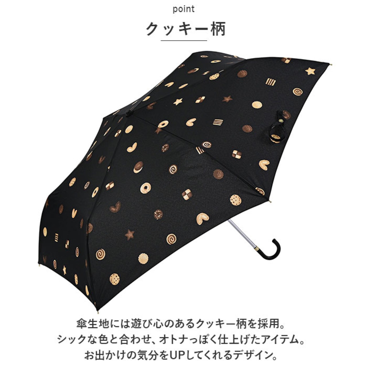 ・傘生地には遊び心のあるクッキー柄を採用。シックな色と合わせ、オトナっぽく仕上げたアイテム。お出かけの気分をUPしてくれるデザイン。