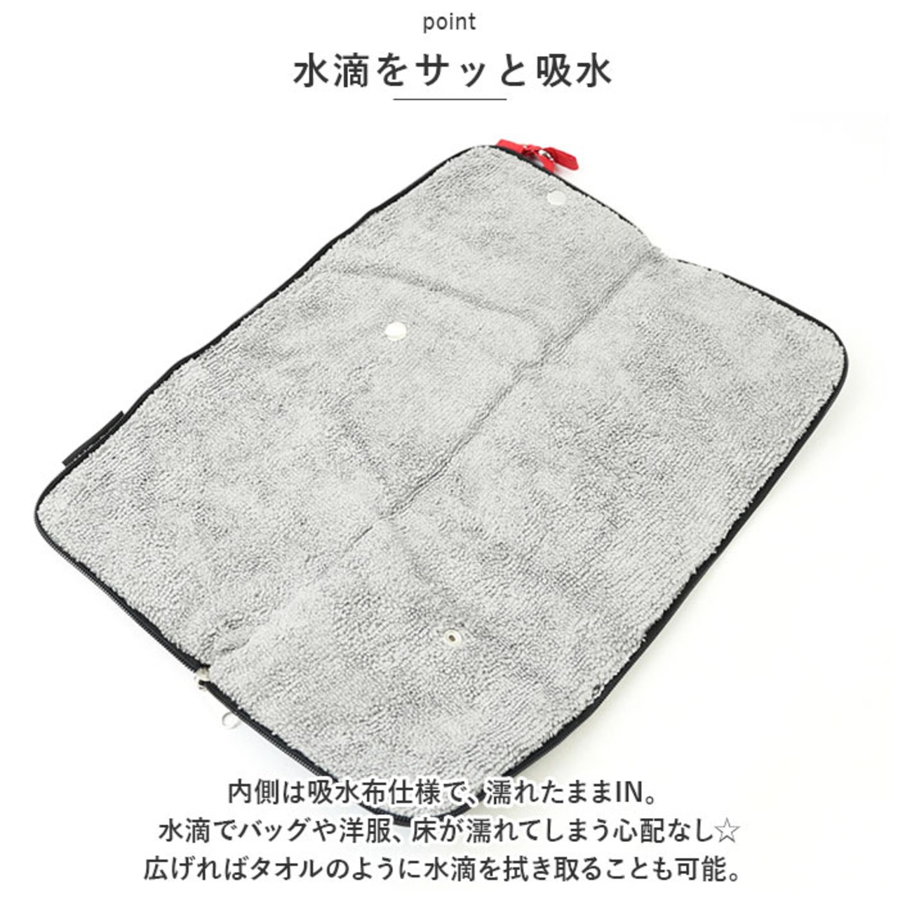 ・内側は吸水布仕様で、濡れたままIN。水滴でバッグや洋服、床が濡れてしまう心配なし☆広げればタオルのように水滴を拭き取ることも可能。