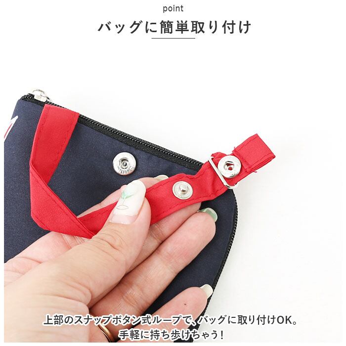 ・上部のスナップボタン式ループで、バッグに取り付けOK。手軽に持ち歩けちゃう!