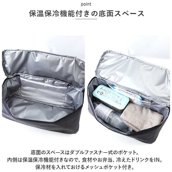 ・底面のスペースはダブルファスナー式のポケット。内側は保温保冷機能付きなので、食材やお弁当、冷えたドリンクをIN。保冷材を入れておけるメッシュポケット付き。
