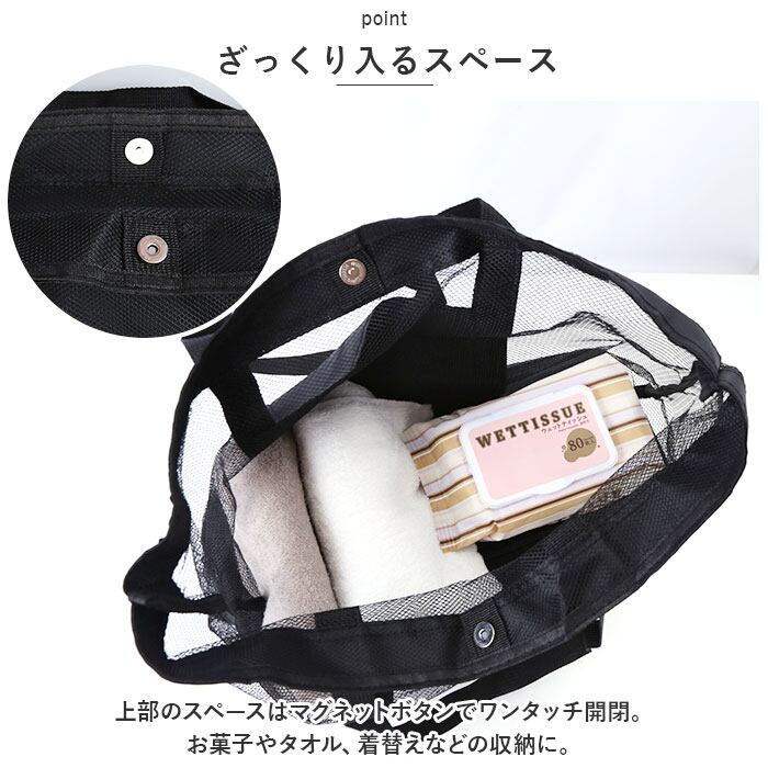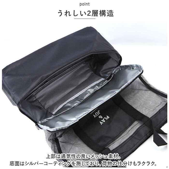 ・上部は通気性の良いメッシュ素材。底面はシルバーコーティングを施しており、荷物の仕分けもラクラク。