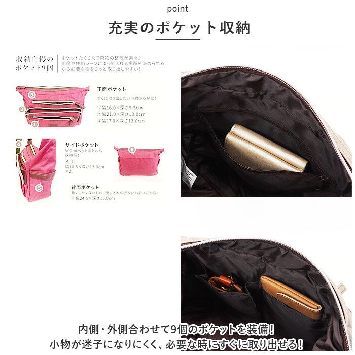・内側・外側合わせて9個のポケットを装備!小物が迷子になりにくく、必要な時にすぐに取り出せる!