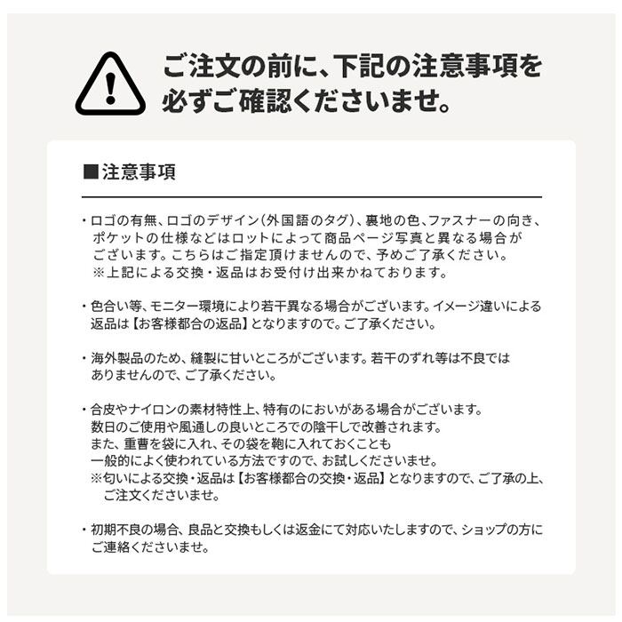 ・各所に配置された合皮素材や、文字入りのショルダーベルト。フロントのロゴタグもデザインのポイントに。