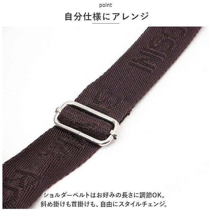 ・ショルダーベルトはお好みの長さに調節OK。斜め掛けも首掛けも、自由にスタイルチェンジ。