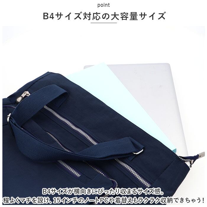 ・B4サイズが横向きにぴったり収まるサイズ感。程よくマチを設け、15インチのノートPCや着替えもラクラク収納できちゃう!