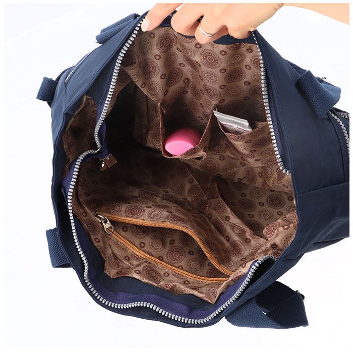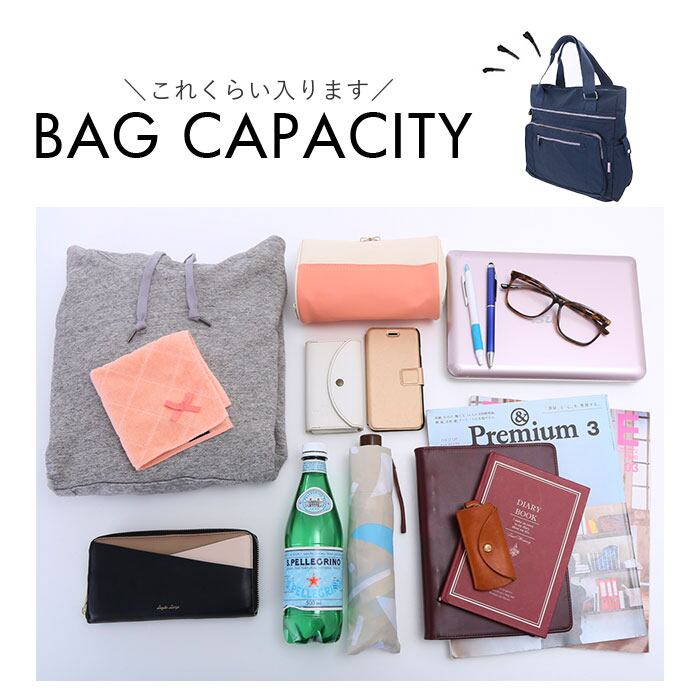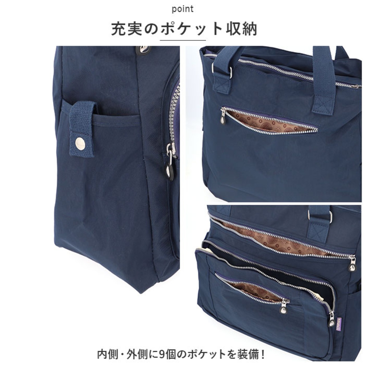 ・内側・外側に9個のポケットを装備!小物を整理整頓できるポケット、ペットボトルや折りたたみ傘の収納に便利なサイドポケットなど、使いやすさにこだわった仕様。