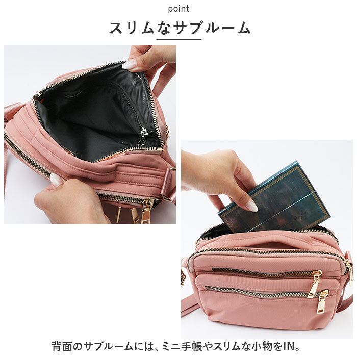 ・メインルーム&サブルームを装備。どちらもファスナー開口で、中身がこぼれ落ちることなくプライバシーを確保。