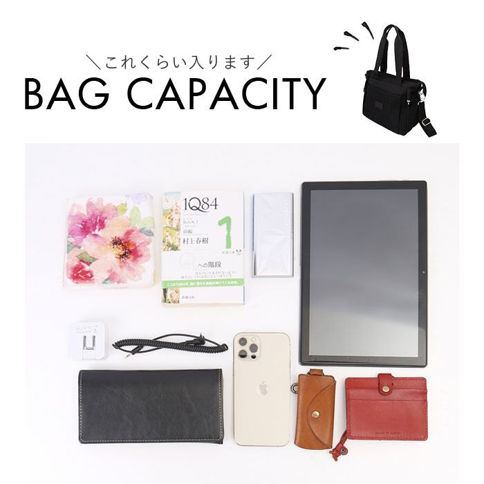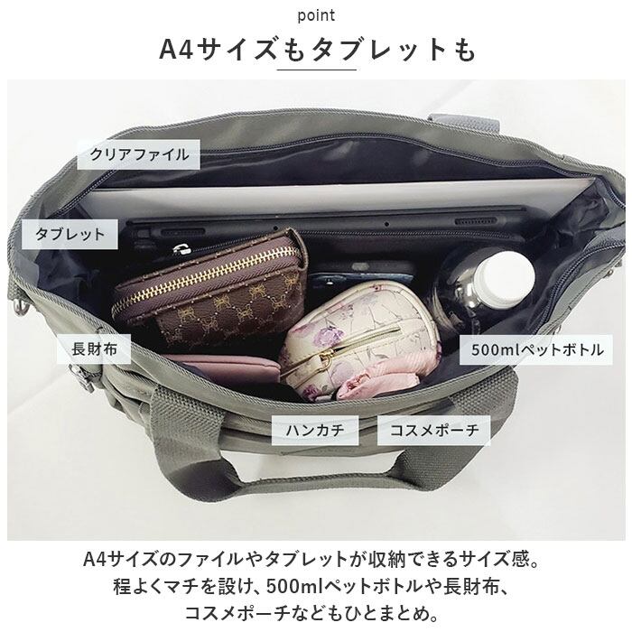 ・A4サイズのファイルやタブレットが収納できるサイズ感。程よくマチを設け、500mlペットボトルや長財布、コスメポーチなどもひとまとめ。