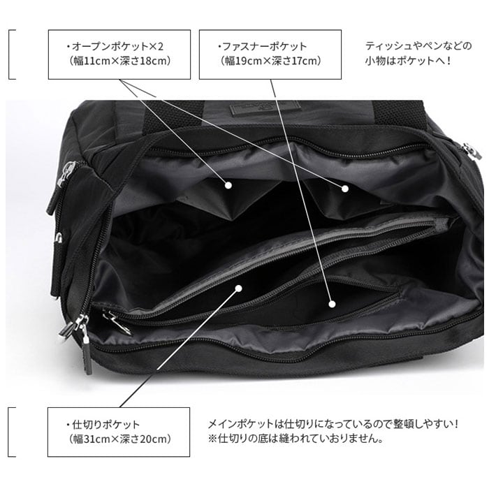 ・開口部は天ファスナー式。中身がこぼれ落ちにくく、プライバシーを確保。