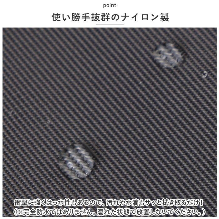 ・軽くて丈夫なナイロン素材を採用。衝撃に強くはっ水性もあるので、汚れや水滴もサッと拭き取るだけ!気にせずガシガシ使えちゃう!(※完全防水ではありません。濡れた状態で放置しないでください。)