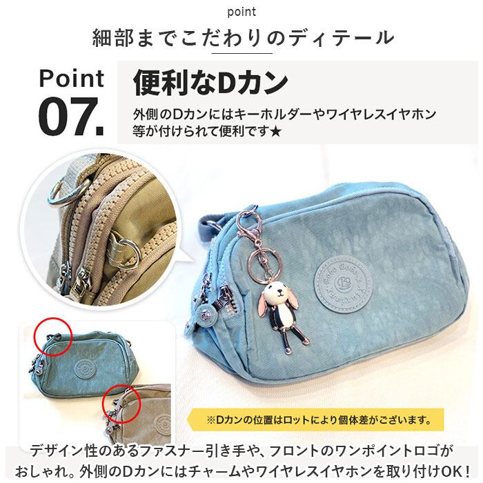 ・デザイン性のあるファスナー引き手や、フロントのワンポイントロゴがおしゃれ。外側のDカンにはチャームやワイヤレスイヤホンを取り付けOK!