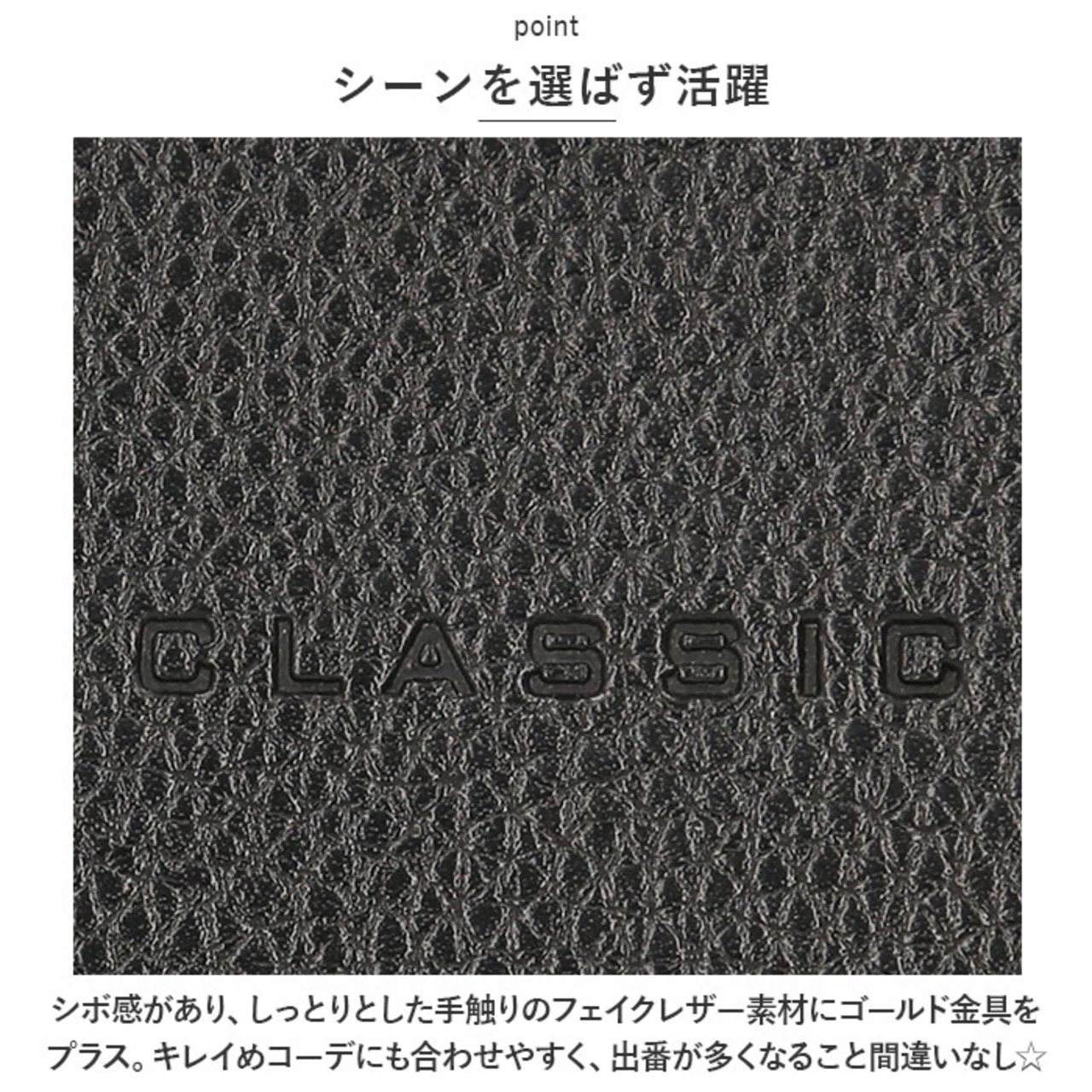 ・シボ感があり、しっとりとした手触りのフェイクレザー素材にゴールド金具をプラス。キレイめコーデにも合わせやすく、出番が多くなること間違いなし☆