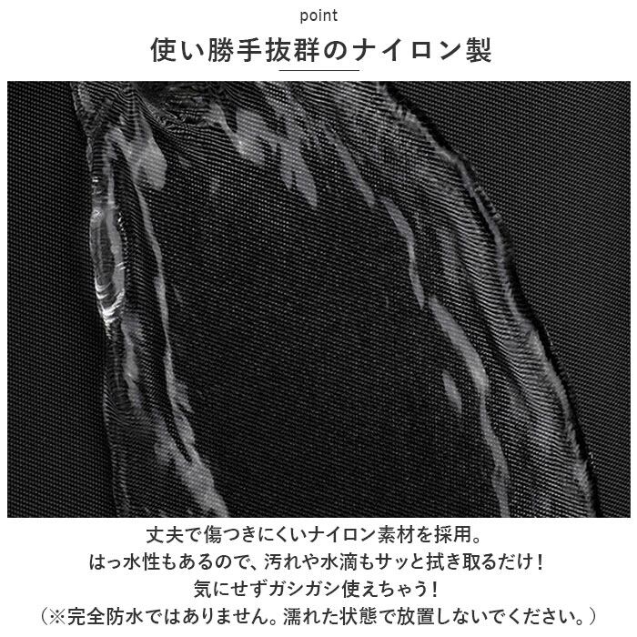 ・丈夫で傷つきにくいナイロン素材を採用。はっ水性もあるので、汚れや水滴もサッと拭き取るだけ!気にせずガシガシ使えちゃう!(※完全防水ではありません。濡れた状態で放置しないでください。)