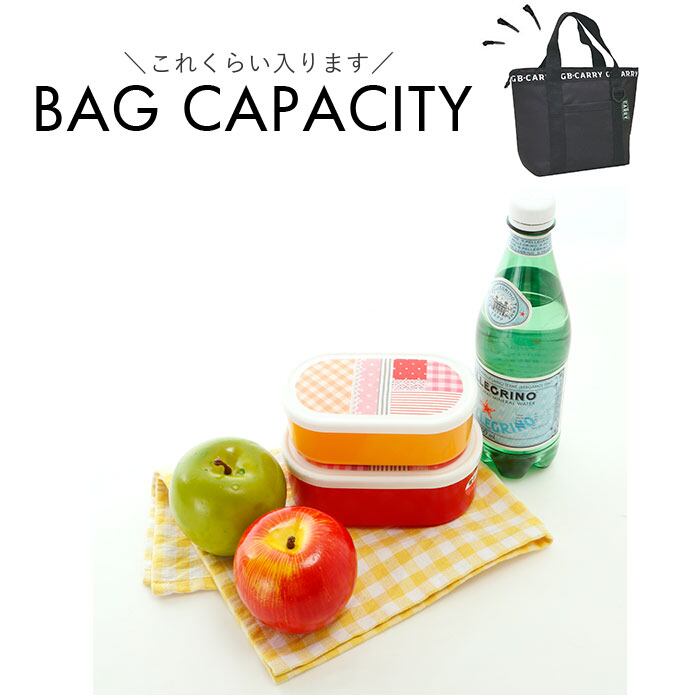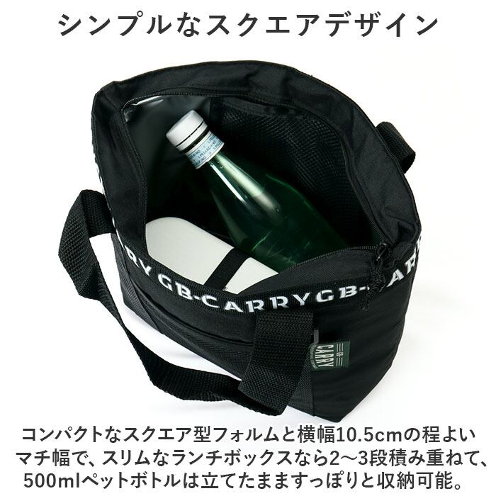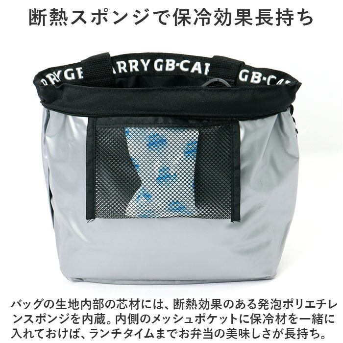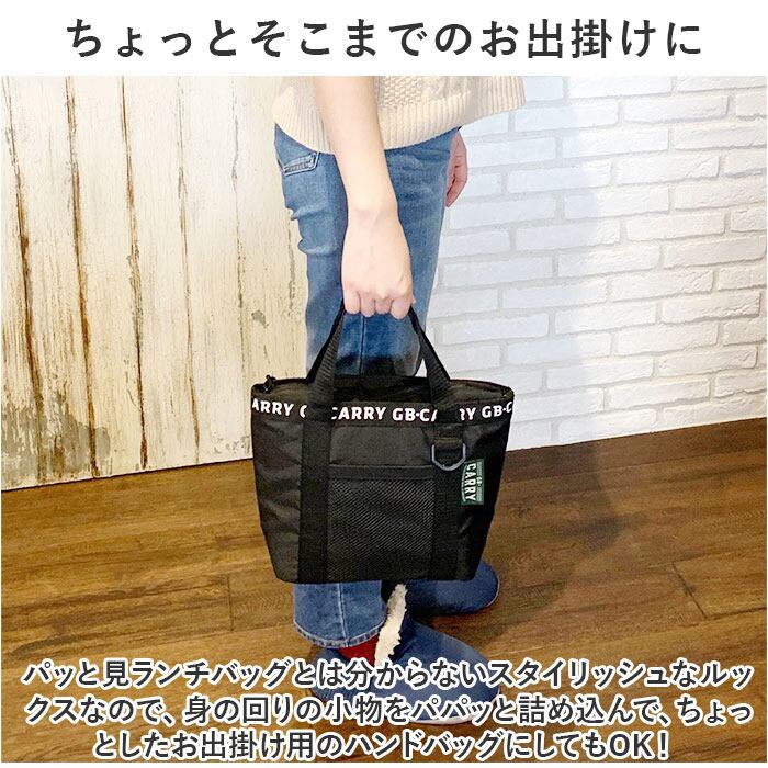 ※ブラックのテープに「GB-CARRY」のロゴが浮かびあがる、ON/OFFどちらのファッションに合わせやすいクールなユニセックスカラー。通勤通学用のランチバッグにはもちろん、行楽やレジャーにも大活躍。