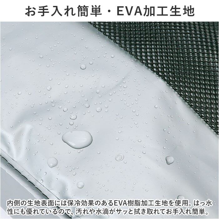 ・内側の生地表面には保冷効果のあるEVA樹脂加工生地を使用。はっ水性にも優れているので、汚れや水滴がサッと拭き取れてお手入れ簡単。
