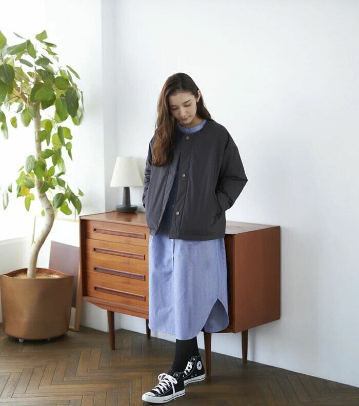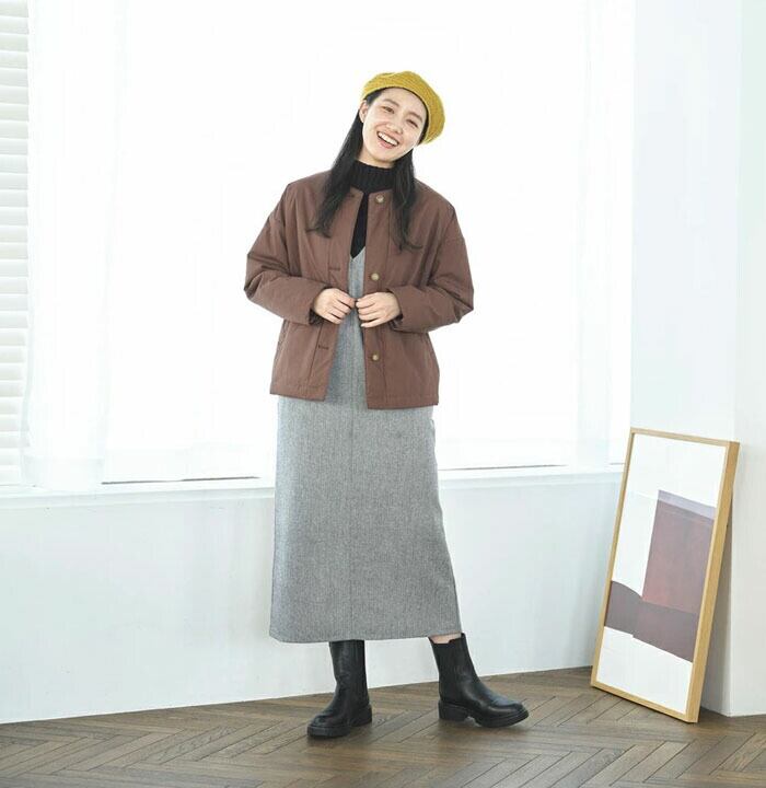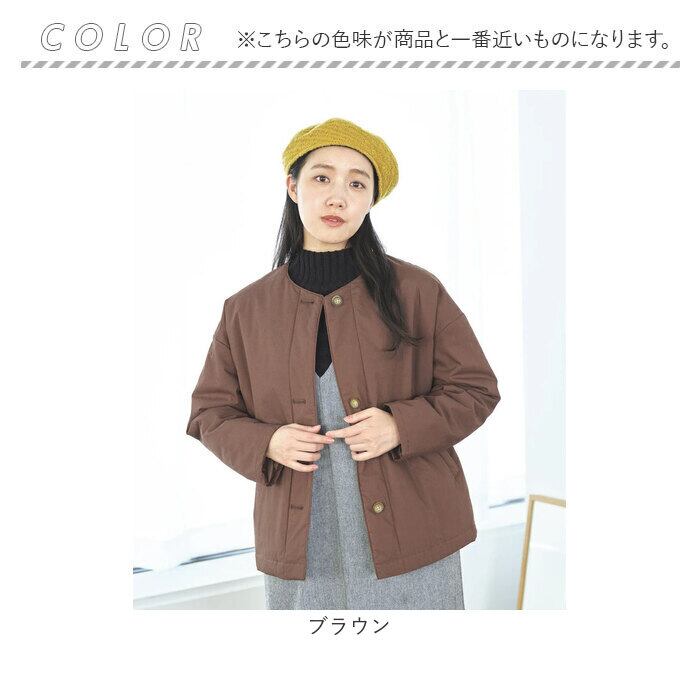 ・シンプルなノーカラーダウンジャケットは、どんな服にもなじみやすい、ナチュラルなカラー展開。