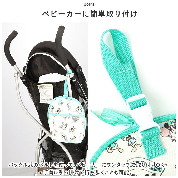 ・バックル式のベルトを使って、ベビーカーにワンタッチで取り付けOK。手首に引っ掛けて持ち歩くことも可能。