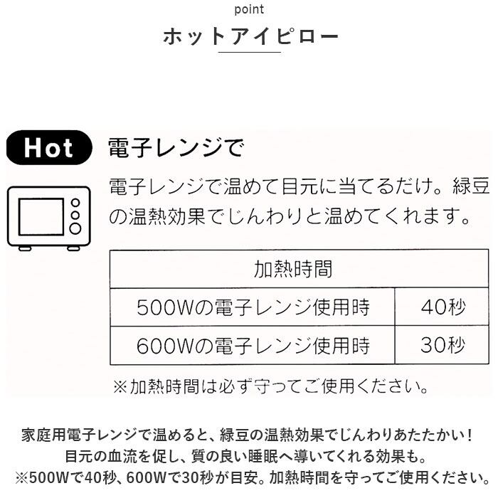・家庭用電子レンジで温めると、緑豆の温熱効果でじんわりあたたかい!目元の血流を促し、質の良い睡眠へ導いてくれる効果も。(※500Wで40秒、600Wで30秒が目安。加熱時間を守ってご使用ください。)
