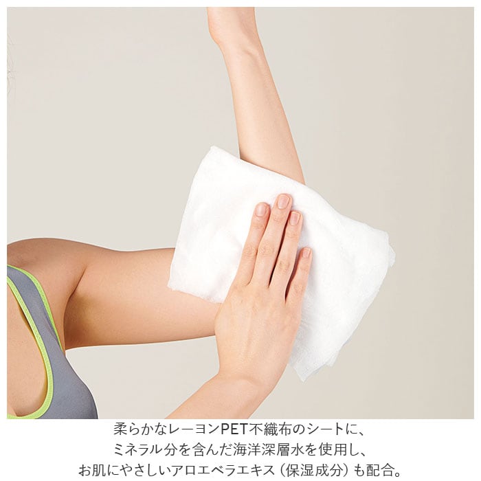・柔らかなレーヨンPET不織布のシートに、ミネラル分を含んだ海洋深層水を使用し、お肌にやさしいアロエベラエキス(保湿成分)も配合。