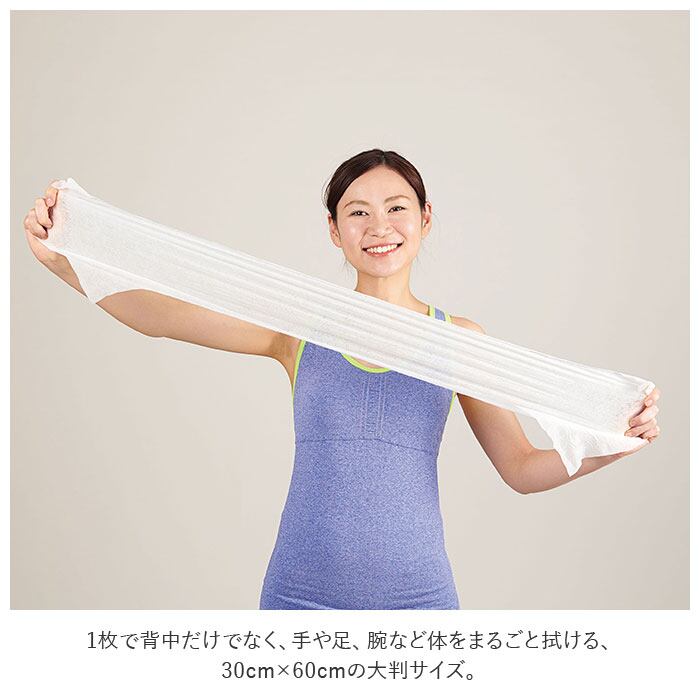 1枚で背中だけでなく、手や足、腕など体をまるごと拭ける、30cm×60cmの大判サイズ。